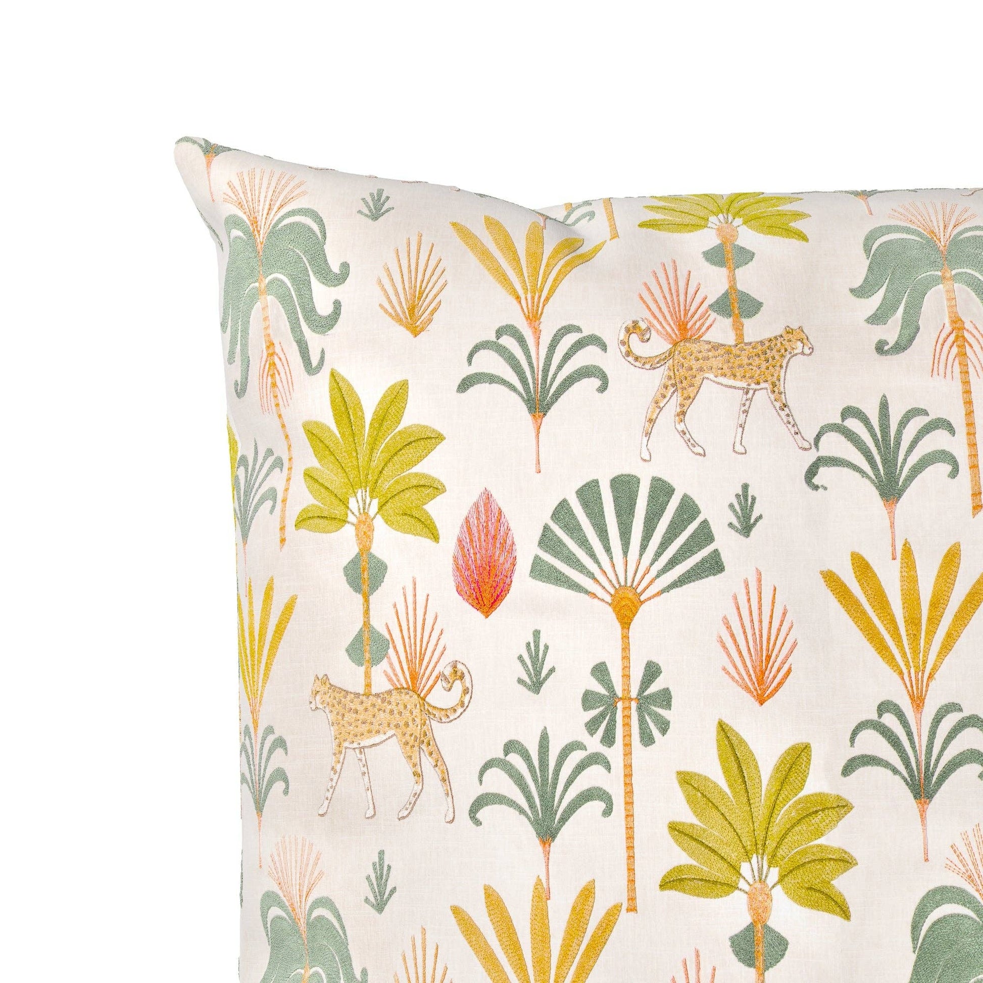 Explore our Azores Throw Pillow featuring a playful safari-themed print with illustrated cheetahs and colorful tropical foliage in soft, earthy tones. Both decorative and supportive, it's perfect for adding a touch of whimsy to your bedroom, reading nook, or cozy corner.