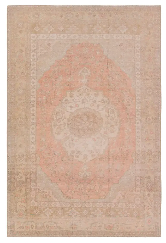 The Adeline rug's orange, tan, light green, brown, and cream tones ground spaces with luxe appeal and an ornate medallion with Persian inspiration. This low-pile rug is made of soft polyester and features a stunning, Old World-inspired digitally printed design.